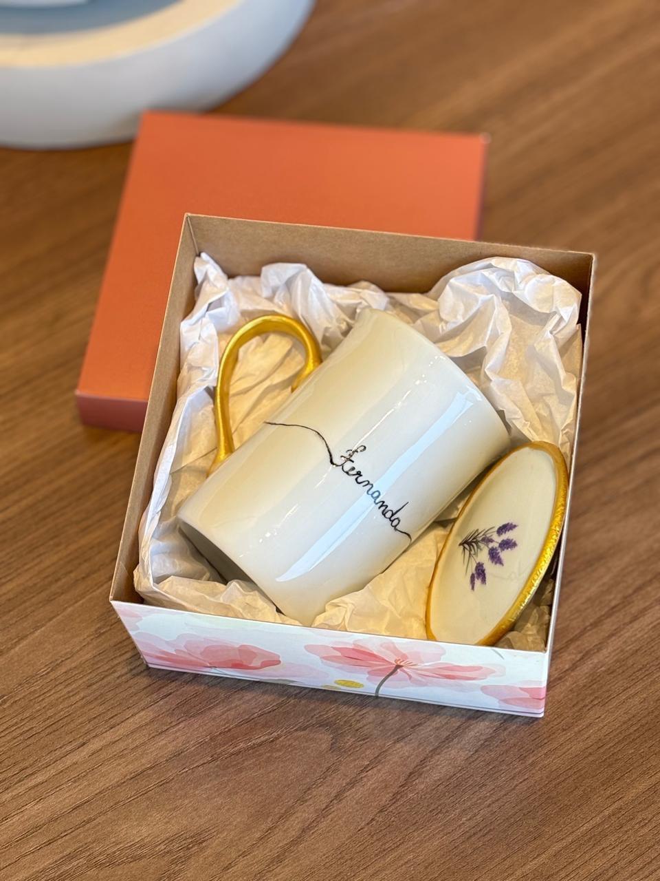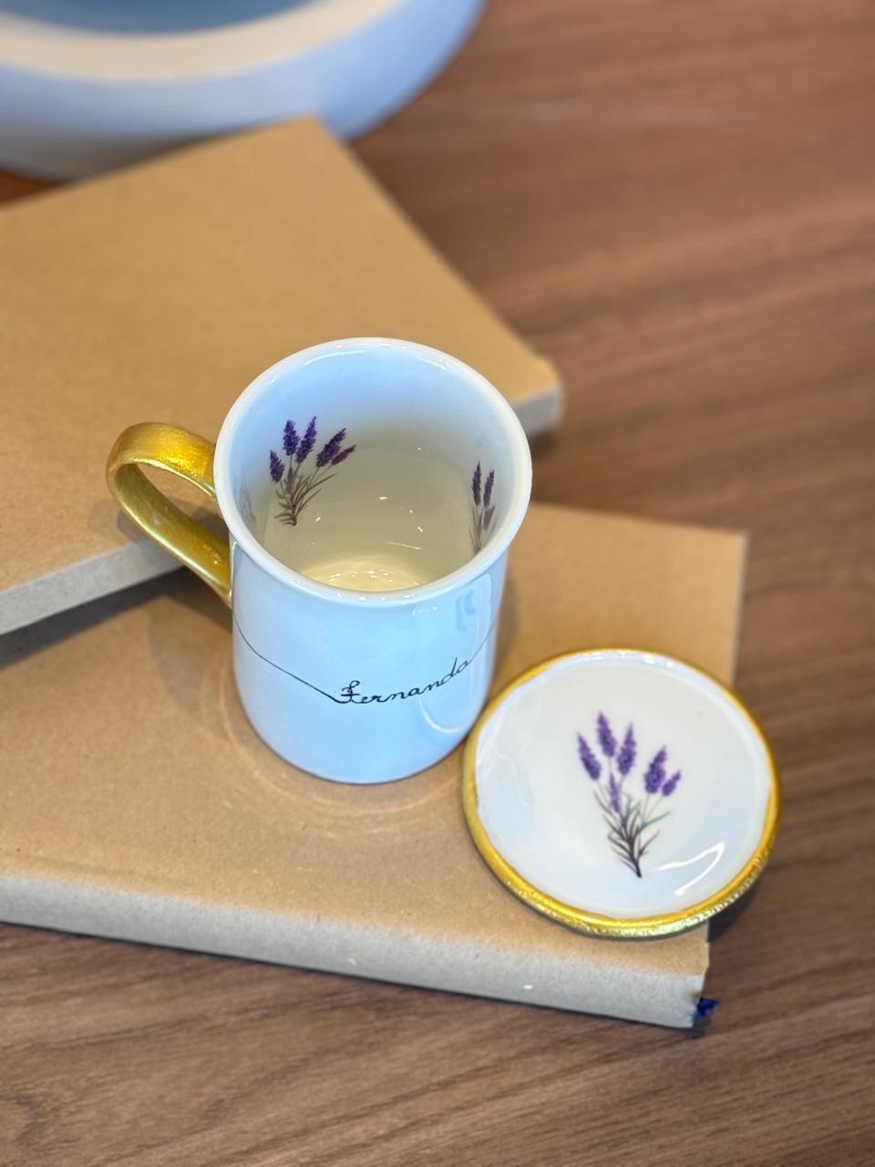 Uma peça delicada e sofisticada para o seu dia a dia ou para presentear alguém especial. A caneca de porcelana vem acompanhada de uma tampa com detalhe floral em lavanda e acabamento dourado, que dá um toque de elegância.